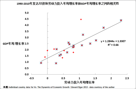 发达经济体劳动力投入增长率和GDP增长率之间的相关性为 0.66 ——正相关性也较强;