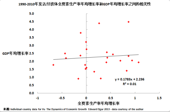 发达经济体全要素生产率和GDP增长率之间的相关性为0.01 ——基本上相当于零相关性。
