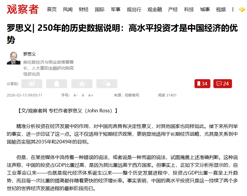 编者按:“中国较高的投资水平说明,它如今正处于自工业革命以来持续发展的领头羊位置。”3月13日,前英国伦敦市经济与商业政策署署长、中国人民大学重阳金融研究院高级研究员罗思义在观察者网发表评论文章强调,中国较高的投资水平并非反常现象。这是自工业革命以来持续进行了250年的经济进程的最新体现,也是中国在特定国情下、顺应历史发展趋势所展现的经济先进性和发展水平的标志。现将全文发布如下:(全文约11800字,预计阅读时间30分钟)