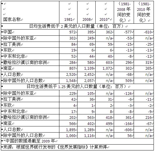 据世界银行数据显示,中国1981年月均生活费低于37.50美元的人数为9.72亿,2008年时则减至1.73亿,2009年时更降至1.57亿。也即是说,27年后的2008年有6.62亿、2009年有6.78亿中国人摆脱了极度贫困。