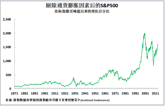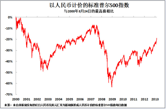 根据美国主要贸易伙伴的美元指数来计算,标准普尔500指数在2000年9月11日达到峰值。此后至2013年5月24日的这周止,美元指数下跌了28%。如果将汇率下跌的因素考虑在内,按照国际美元指数来衡量,美国股价下跌了20%。当然,如果再考虑通货膨胀因素,那标准普尔500指数下跌的幅度更大。