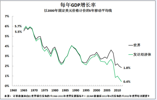 世界经济平均增长率已经从上世纪60年代的5.5%降至2012年的1.8%。同期的发达经济体GDP增长率则从5.7%降至 0.4%。
