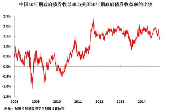 首先,为体现中国因高利率遭受的国内和国际损失是多么严重,特将中美2008年至2014年间10年期政府债券收益率价差作比较(见图1)。对企业投资非常重要的长期贷款利率通常是以政府债券为基准,后者也是比较中美利率的最合适衡量方式。