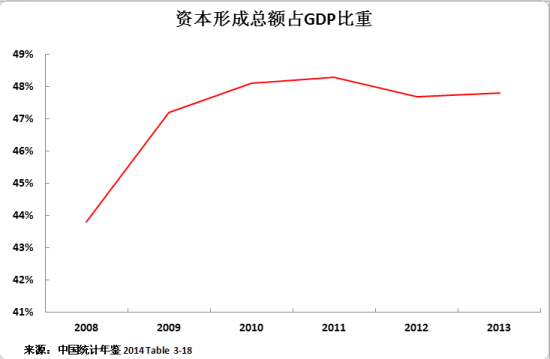 相比之下,最新发布的2010-2013年全年数据显示,中国投资占GDP比重小幅下滑,从48.1%跌至47.8%。2014年的全年数据还没有出炉,但很明显,在这一期间,投资率一直在下滑——2014年1-10月份固定资产投资增速从2013年同期的20.1%跌至15.9%。