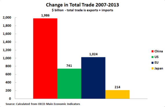 China`s total merchandise trade in 2013 was $1,986 billion larger than in 2007 - China`s exports having increased by $992 billion and imports by $994 billion. In comparison, the increase in the U.S. goods trade was $741 billion, the EU $1,024 billion, and Japan $214 billion.