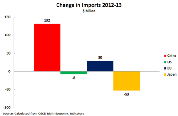The change was even more dramatic for imports. In 2013 China`s goods imports were $993 billion above their 2007 level, whereas U.S. imports were up by $311 billion, the EU`s by $329 billion, and Japan`s by $212 billion. China`s imports rose by more than three times as much as the United States - and by more than the United States, EU and Japan combined. China was therefore, by a huge margin, the most rapidly expanding market for other countries` exports.