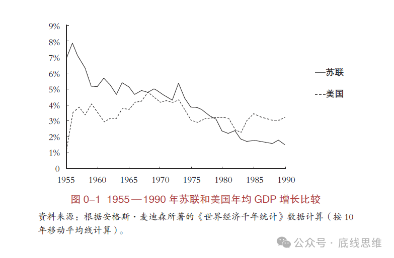 面对资本主义经济体的长期快速增长,苏联并未改变其经济结构。虽然苏联国内投资仍维持较高水平,但它仍然是一个相对自给自足的封闭经济体系。也就是说,它仍然被排斥在国际劳动社会化之外,保留了全盘国有化的城市经济、集体农庄。处于社会主义初级阶段的苏联的这种经济结构并不符合马克思主义。结果是,20世纪60年代,苏联年均GDP增速不再快于美国,到20世纪70年代中期,苏联年均GDP增速实际上慢于美国(见图0-1),甚至到20世纪70年代中期,苏联已深陷经济危机。
