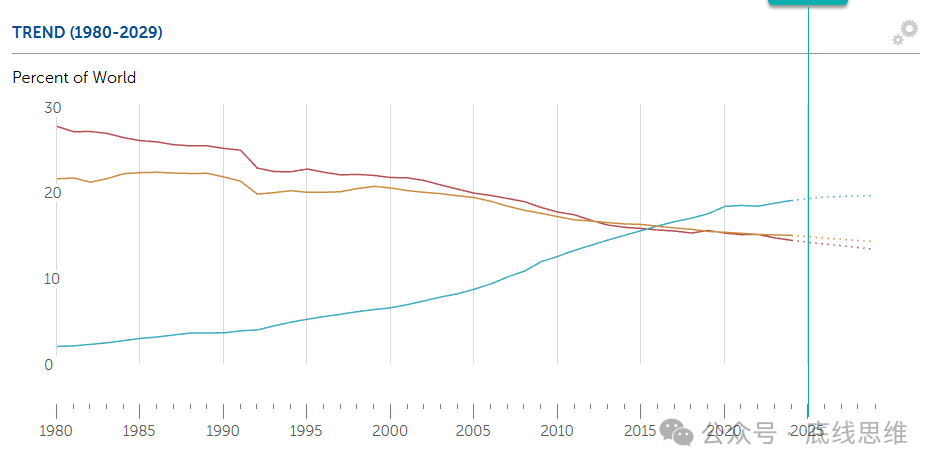 ▲1980年以来,中国(蓝)、美国(橙)与欧盟(红)GDP占全球份额变化,基于购买力平价指数。 图自:国际货币基金组织