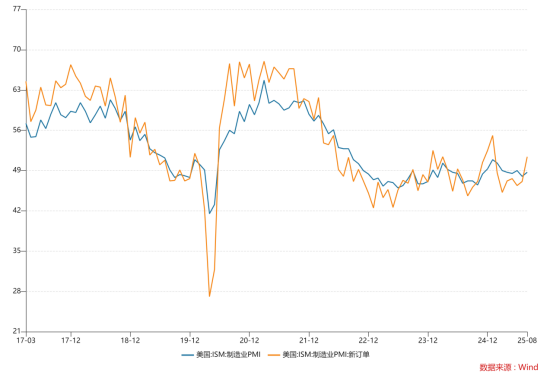▲2017年-2025年8月美国制造业PMI及其新订单PMI指数发展变化情况