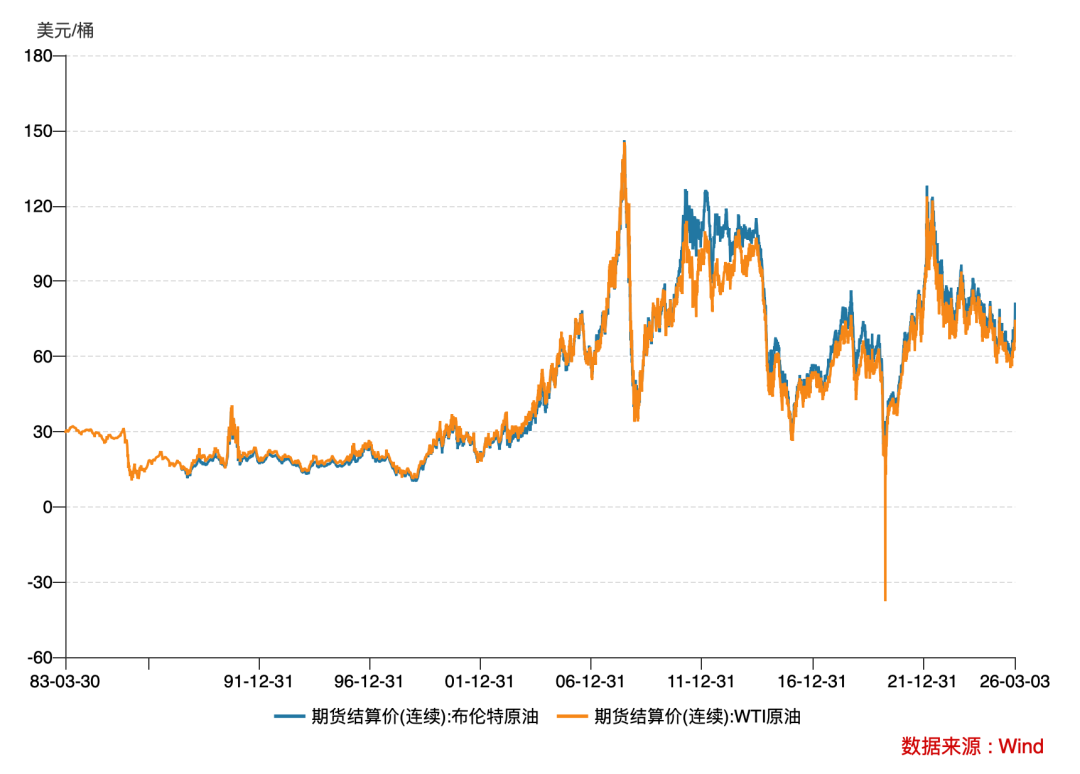 ▲1983年-2026年3月3日的国际油价变化图(WTI和布伦特原油)