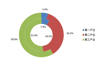 三是经济结构优化升级。服务业在GDP中的占比达51.6%,对国民经济增长的贡献率为58.8%,拉动全国GDP增长4个百分点,比第二产业高出1.5个百分点,在GDP的占比和贡献率都超过了第一和第二产业的总和。经济结构调整实现了质的突破,第三产业已经成为经济增长的引擎。