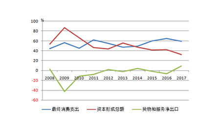 四是经济动力转换。消费成为三驾马车的主力,拉动经济增长。2017年,净出口对经济增长的贡献率为9.1%,比上年提高了18.7个百分点,扭转了连续两年下行格局。尽管净出口对经济增长的拉动力明显提升,但最终消费支出仍是拉动经济增长的主要动力。最终消费支出对经济增长的贡献率已达58.8%,高于投资的贡献率26.7个百分点。消费这驾马车已经成为经济增长的主要拉动力。