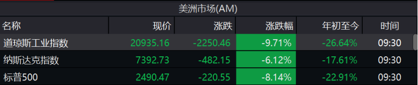 北京时间16日晚21时30分(美东时间16日上午9时30分),道琼斯指数开盘下跌2250点,跌幅9.71%,现报20935点;纳指跌6.12%,标普500指数跌8.14%。由于熔断,美股暂停交易15分钟,这已经是短短几天之内美股的第三次熔断。