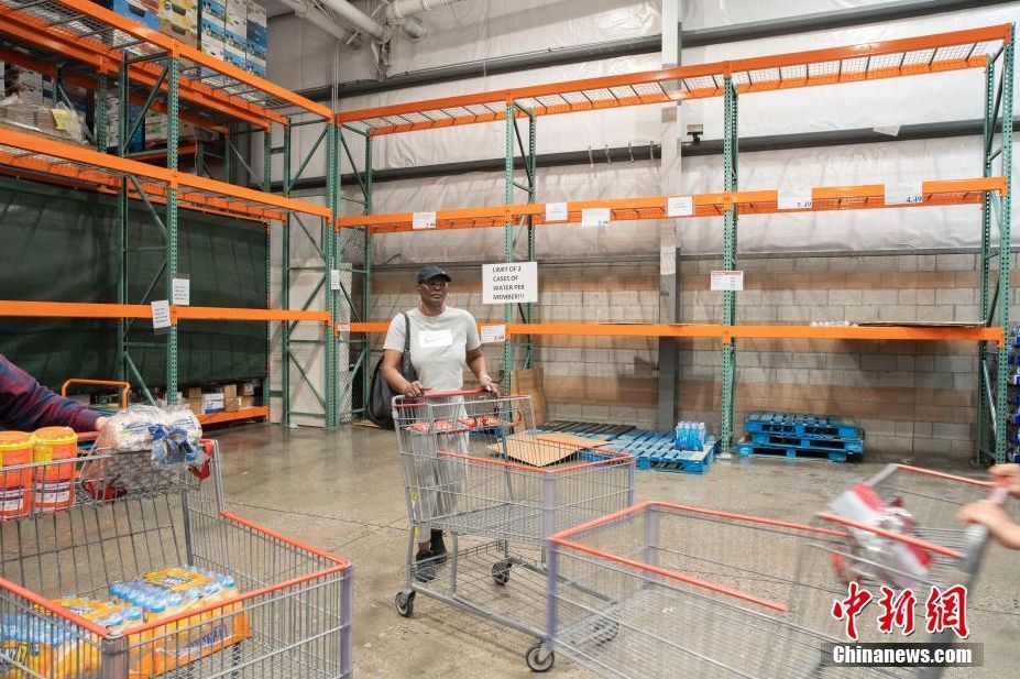 当地时间3月11日,美国旧金山湾区奥克兰的一家Costco超市摆放饮用水的货架上,张贴着每位会员限购两件的通知。随着新冠肺炎疫情的发展,美国多地出现民众抢购生活物资的现象。