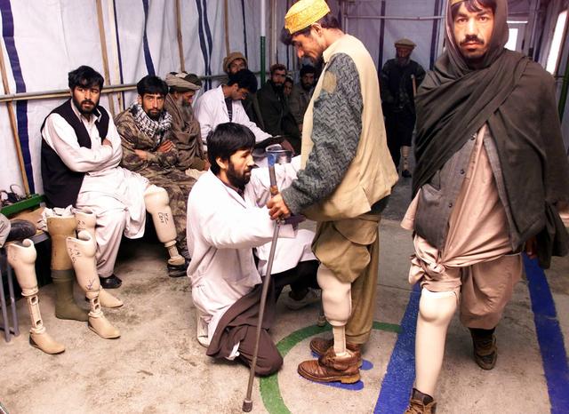 2002年1月12日,残疾人在喀布尔国际红十字会开办的康复中心内进行康复训练。图自新华社。
