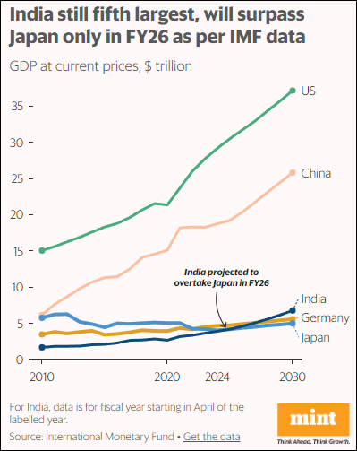 根据IMF的预测,印度目前其实仍为世界第五大经济体,超越日本可能要到2026财年实现。MINT