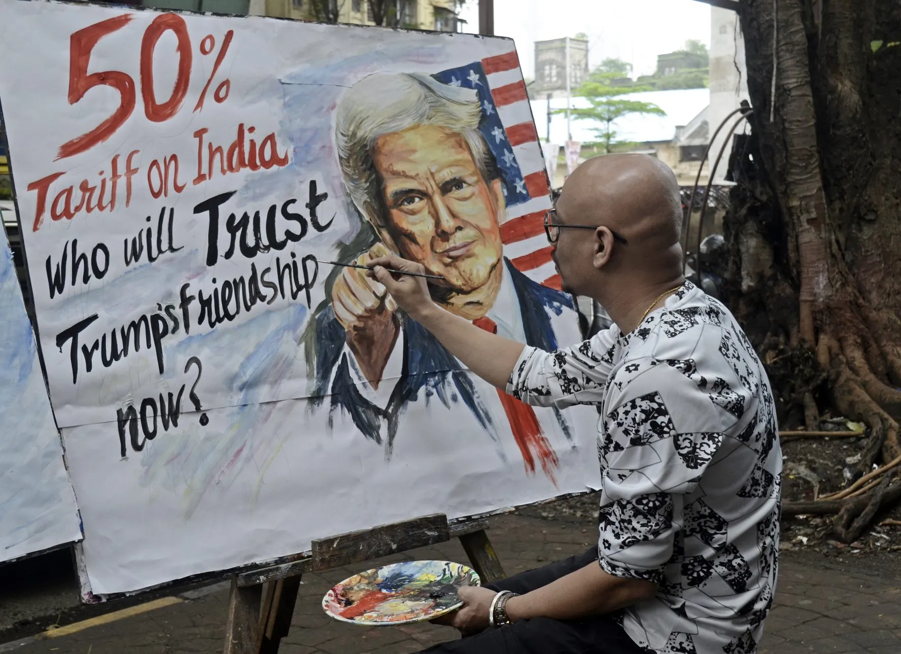 2025年8月7日,一位艺术家在印度孟买创作一幅描绘美国前总统唐纳德·特朗普的抗议艺术作品。