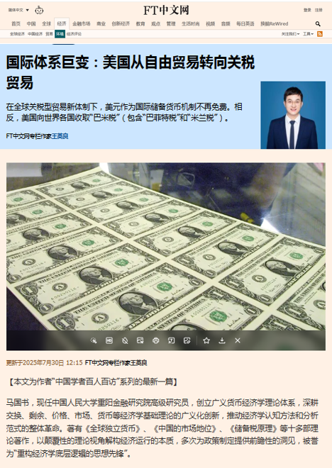 近日,复旦大学国际政治经济学博士、中开国际事务(NEIA)研究部创始部长王英良在英国《金融时报》中文网发起“中国学者百人百访”计划,近期采访了中国人民大学重阳金融研究院高级研究员马国书。