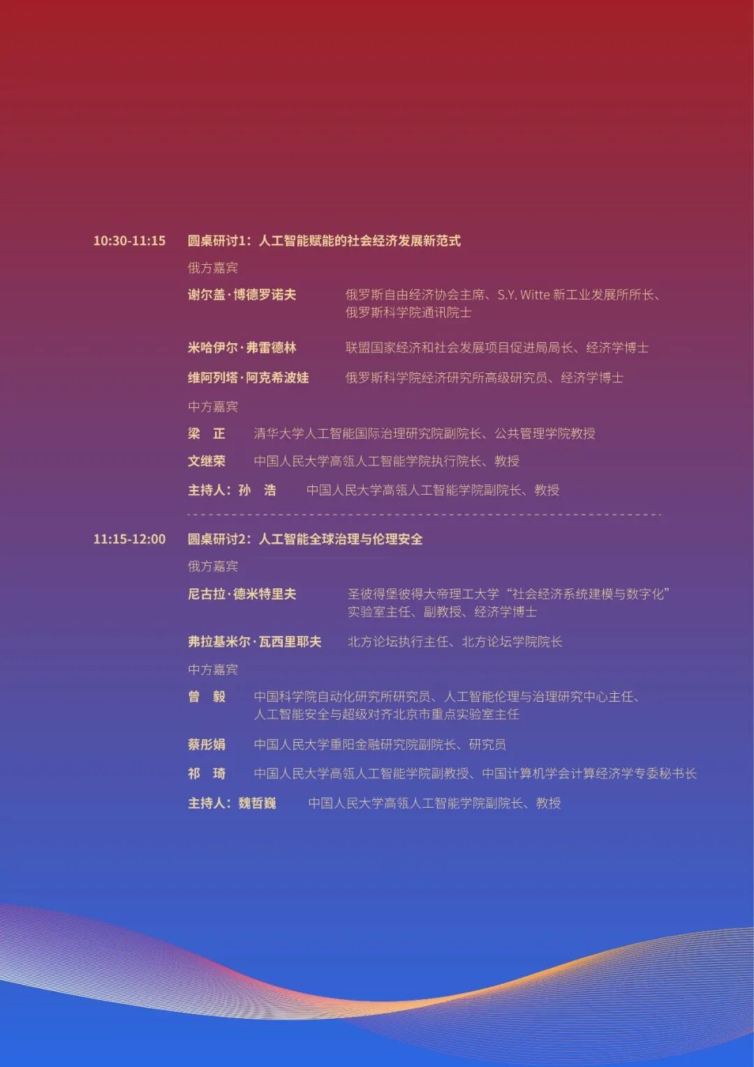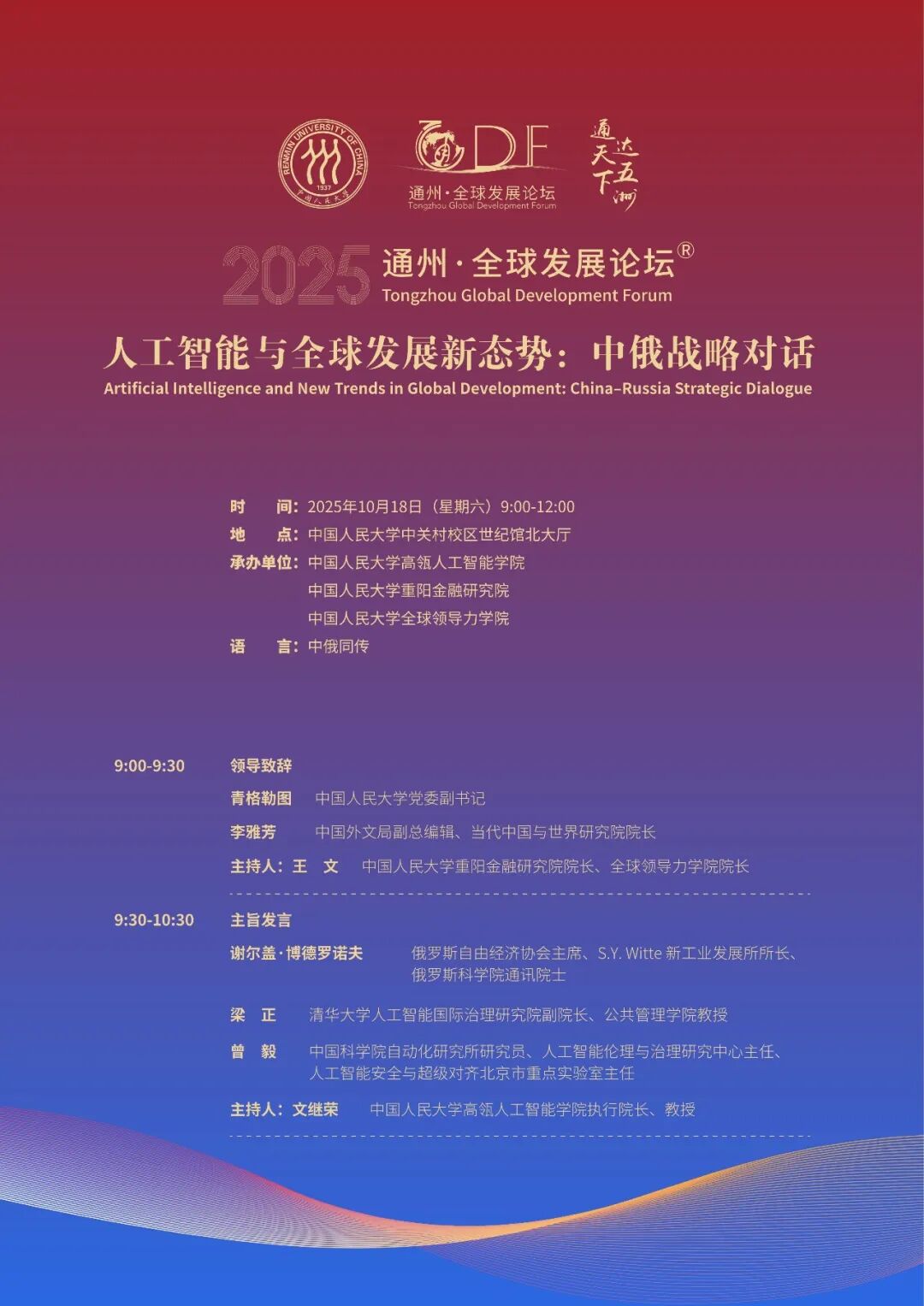 编者按:10月18日,中国人民大学高瓴人工智能学院、重阳金融研究院、全球领导力学院将共同承办2025通州·全球发展论坛“人工智能与全球发展新态势:中俄战略对话”分论坛,20多位中俄嘉宾将共同研讨人工智能赋能的社会经济发展新范式、人工智能全球治理与伦理安全。现将活动议程发布如下: