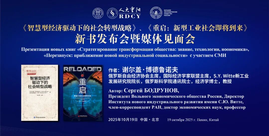 10月19日,由中国人民大学重阳金融研究院、俄罗斯自由经济协会主办,中国人民大学中俄人文交流研究中心、S.Y. Witte新工业发展研究院承办的“面向2050:中俄经济智能化转型的融合战略与增长机遇”国际研讨会暨第十四届中俄智库经济对话将召开。会议期间,将发布俄罗斯自由经济协会主席,国际经济学家联盟主席,S.Y. Witte新工业发展研究院院长,俄罗斯科学院通讯院士,经济学博士,教授谢尔盖·博德鲁诺夫(BODRUNOV Sergey)撰写的《智慧型经济驱动下的社会转型战略》与《重启:新型工业社会即将到来》两本新书。