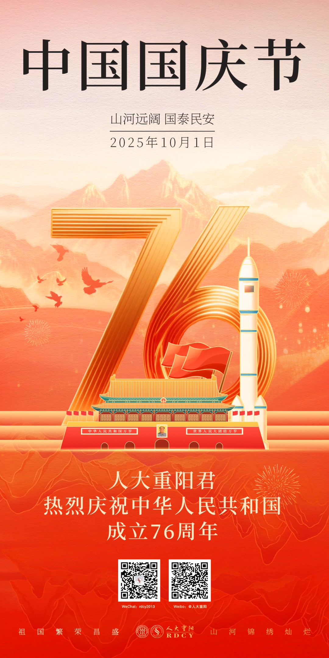 编者按:山河远阔,国泰民安。热烈祝贺中华人民共和国成立76周年。人大重阳君祝您国庆节快乐!
