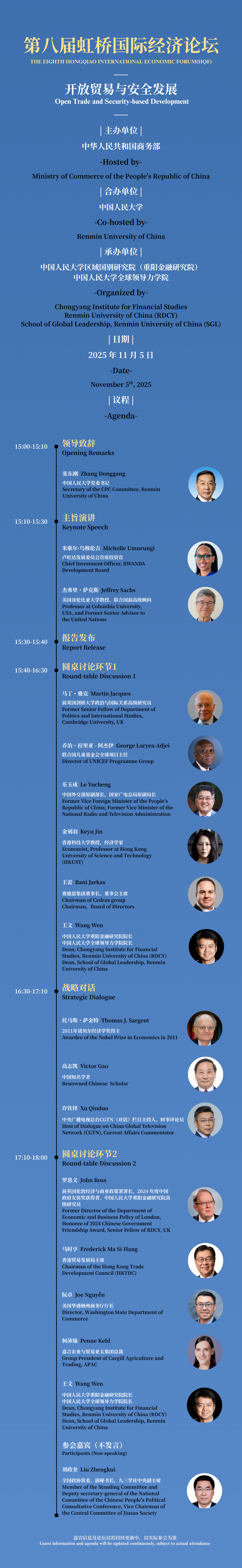 同日下午,由商务部主办,中国人民大学合办,中国人民大学重阳金融研究院(人大重阳)、全球领导力学院承办的第八届虹桥论坛“开放贸易与安全发展”分论坛将直面全球经贸核心议题,邀请中外专家学者共同探讨如何构建开放、包容、普惠、平衡、共赢的全球经贸体系。这是中国人民大学重阳金融研究院自2021年、2022年以来,第三次承办虹桥分论坛。