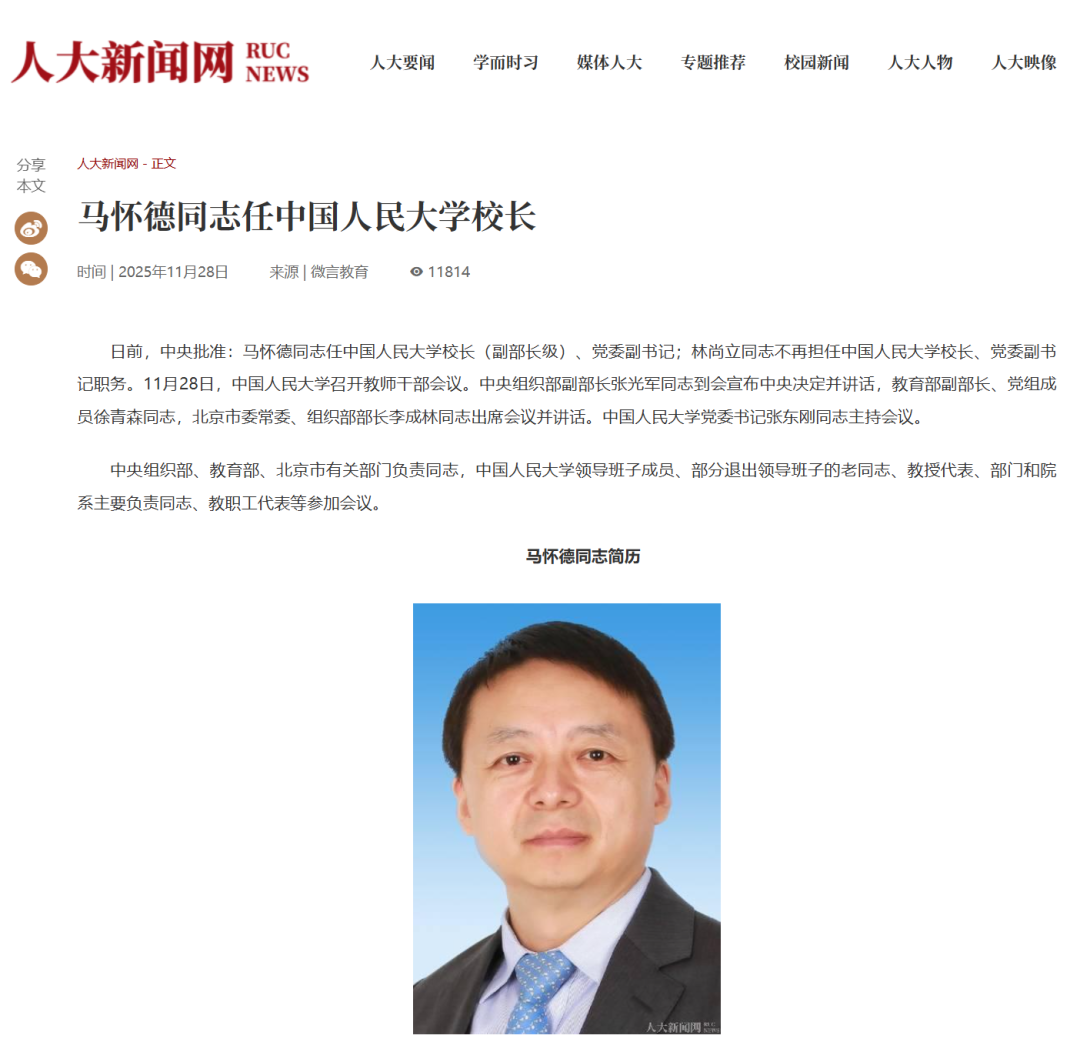 日前,中央批准:马怀德同志任中国人民大学校长(副部长级)、党委副书记;林尚立同志不再担任中国人民大学校长、党委副书记职务。