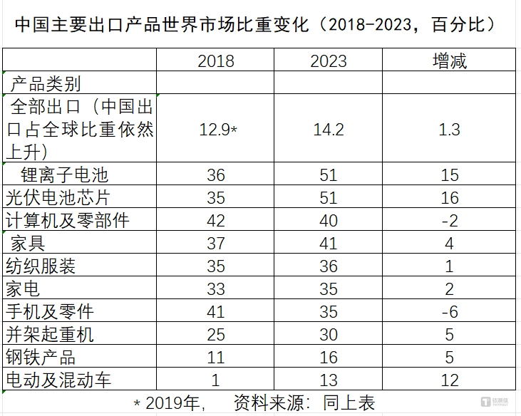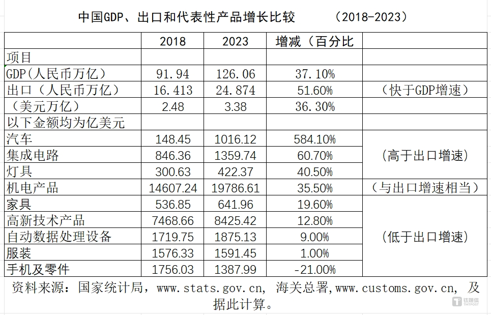 可以看到,整个出口总额,2018-2023年按照美元算增加36.3%,按照人民币本币来算增加51.6%。同期GDP增长37.1%,按照本币计算,出口快于GDP增长,按照美元算和GTP增长差不多。再看汽车、集成电路、灯具累计出口增速高于出口增速,机电产品基本和出口增速相当,低于出口增速的有家居、高新技术、服装、手机零件等,我们对全球出口也是下降,但我们有新的增长点。有下降的点,也有增长的点.