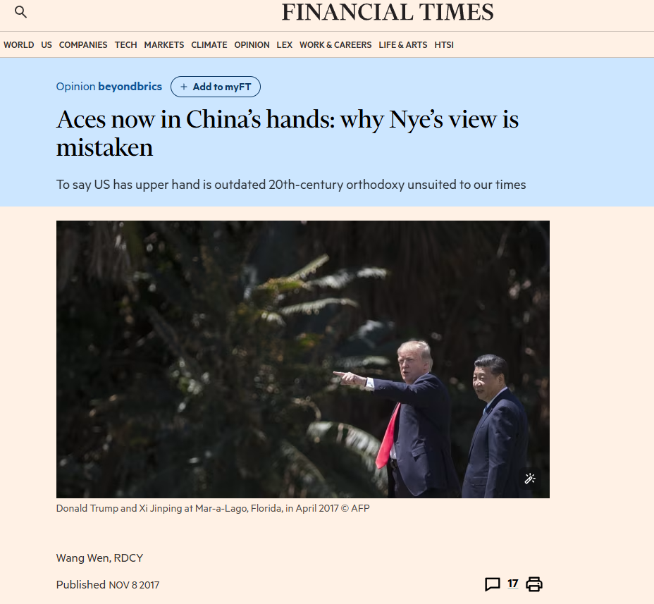 ▲《“王牌”在中国手中,为何约瑟夫·奈是错误的》一文刊发在2017年11月8日英国《金融时报》