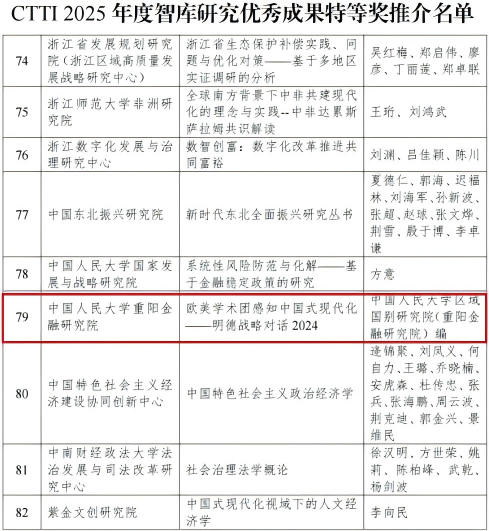 人大重阳在CTTI历年推出的高校智库百强榜中均名列A+,成果屡屡获奖。2024年,《思想坦克:中国智库的过去、现状与未来》获CTTI特等奖,《数据要素赋能商业银行变革》获一等奖,《欧美战略学者明德战略对话系列活动》被评为年度智库建设示范案例;2023年,《“一带一路”十年答卷》丛书获特等奖,“金融强国”系列成果被评为标杆案例;2022年,俄罗斯调研项目入选建设标杆案例,《世界眼中的全球发展倡议》及《碳中和与中国未来》两部图书同获特等奖。2020年,《百年变局》一书获2020CTTI精品成果奖。2018年,《看好中国:一位智库学者的全球演讲》一书获2018CTTI精品成果奖。