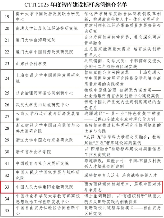 人大重阳网综合报道:2025年11月21日,南京大学中国智库研究与评价中心、光明日报智库研究与发布中心共同举办2025新型智库治理论坛,发布2025年度中国智库索引(CTTI)智库百强榜、智库建设最佳案例、智库研究优秀成果推介名单。中国人民大学重阳金融研究院(人大重阳)参评的三项成果,分别荣获CTTI2025年度智库建设标杆案例、智库研究优秀成果特等奖与一等奖。同时,人大重阳持续入选CTTI2025年度来源高校智库百强榜A+智库。