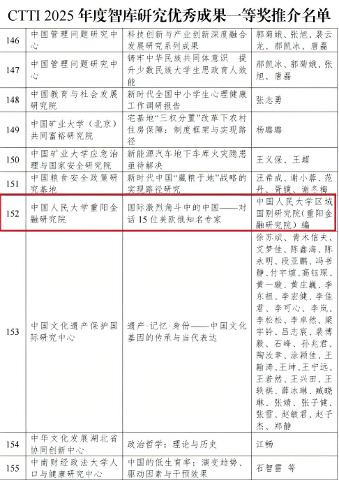 成果《国际激烈角斗中的中国——对话15位美欧俄知名专家》荣获CTTI2025年度智库研究优秀成果一等奖。该书通过展现中国人民大学重阳金融研究院院长、全球领导力学院院长王文与来自美国、欧洲及俄罗斯的15位全球战略专家的深入对话,系统呈现了中西方思想碰撞与认知转化的全过程。