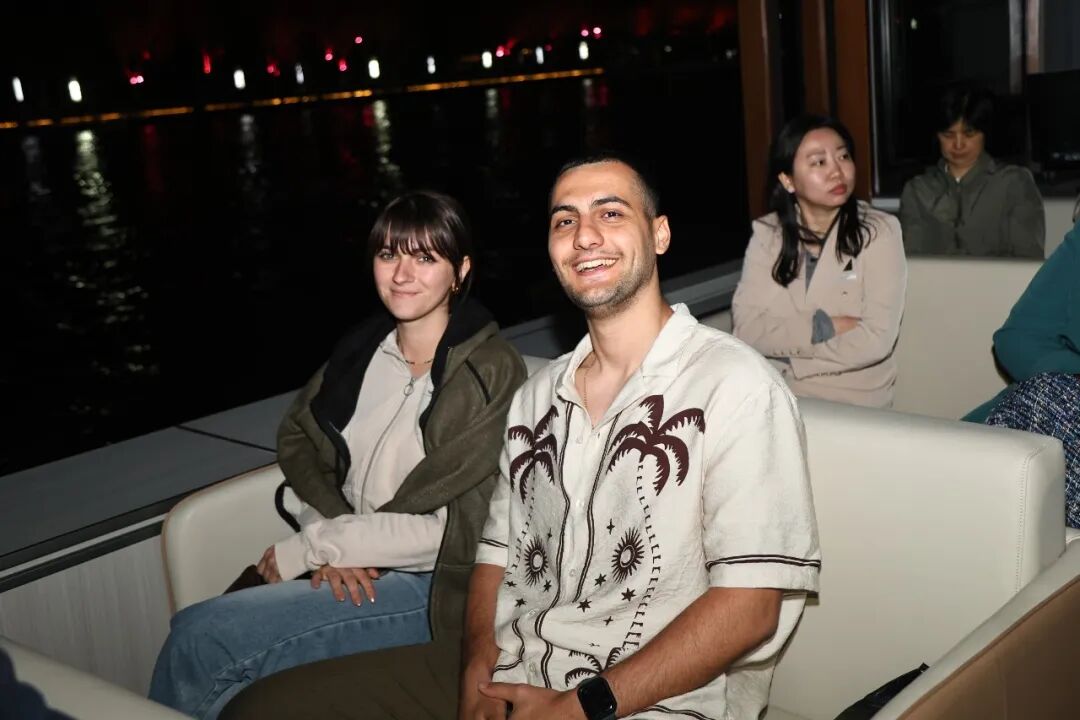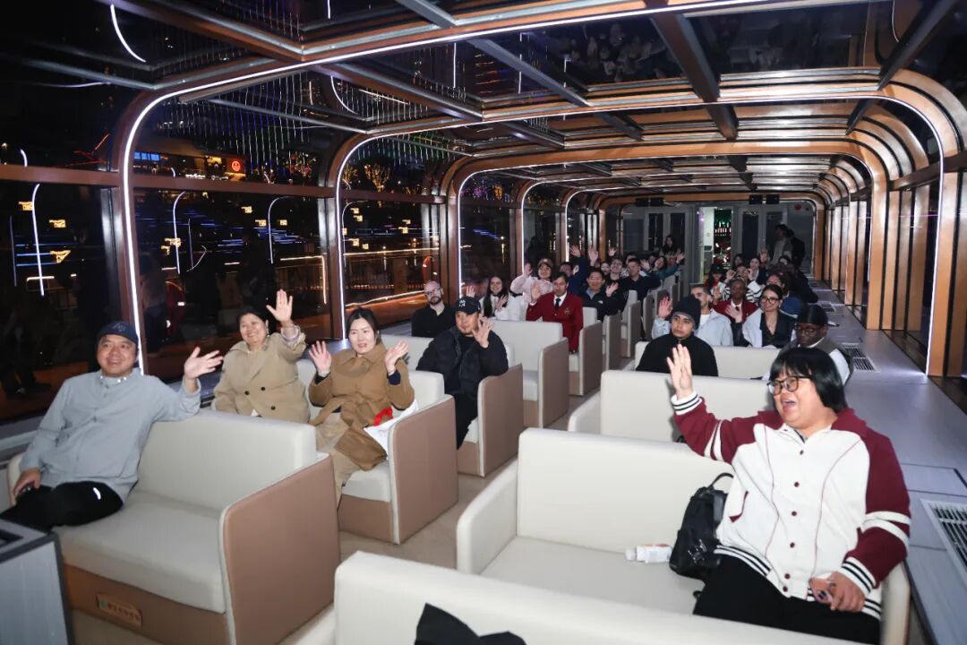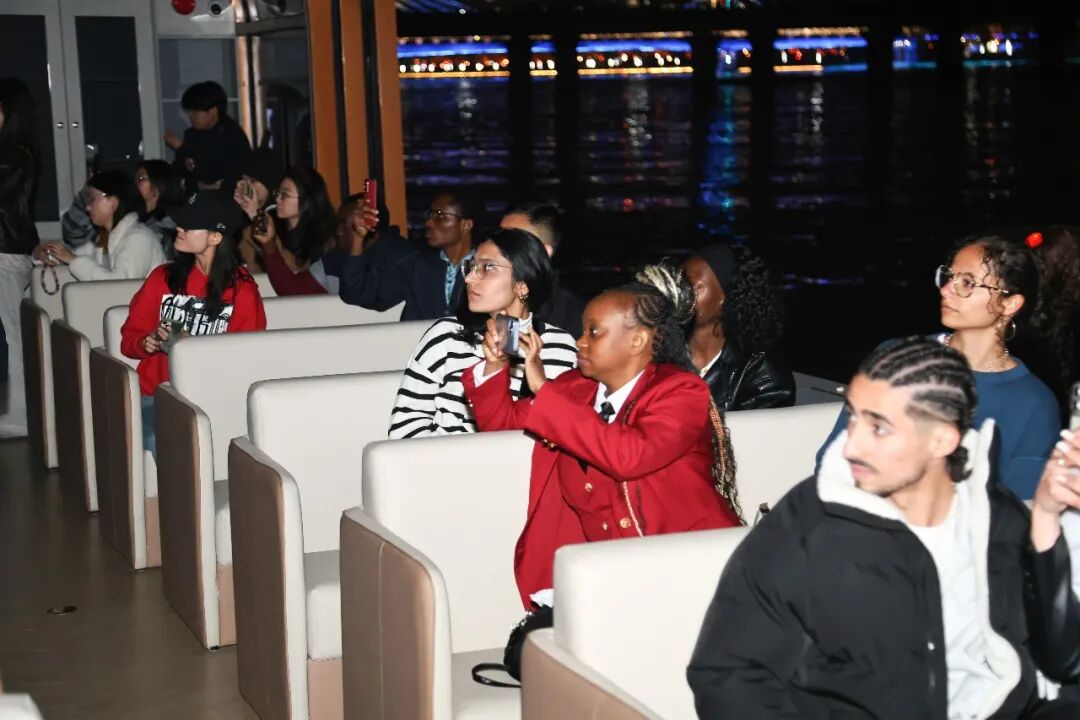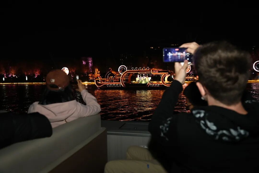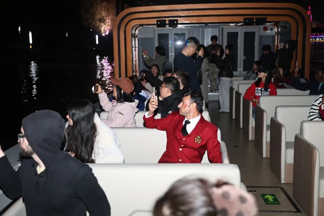 夜幕降临,通州大运河畔华灯初上,3.5公里河道化身为“没有围墙的剧场”。来自阿根廷、巴西、巴基斯坦、法国、加纳、摩洛哥、美国、肯尼亚、赞比亚等18国的中国人民大学师生一行登上全景可开天幕游船,在50分钟的行进式观演中,穿越七大篇章的光影叙事,感受“船在画中游,人在剧中行”的沉浸体验。秀丽的河畔风景、美轮美奂的沿岸建筑、流光溢彩的演出共同绘就壮美画卷,给中外师生一行留下了前所未有的深刻印象。