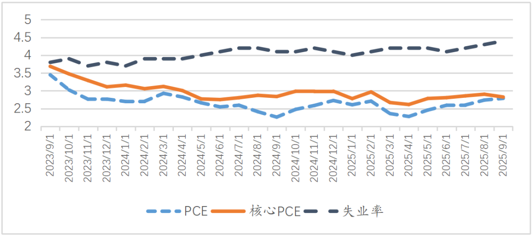 从2025年以来,核心PCE同比增长率变化很小。1-9月份月度均值2.8%,方差仅为0.12%。因此,核心PCE同比增速基本可以视为稳定,但失业率在波动中从1月份的4.0%上升至9月份的4.4%,高于美国经济中的长期失业率4.2%。