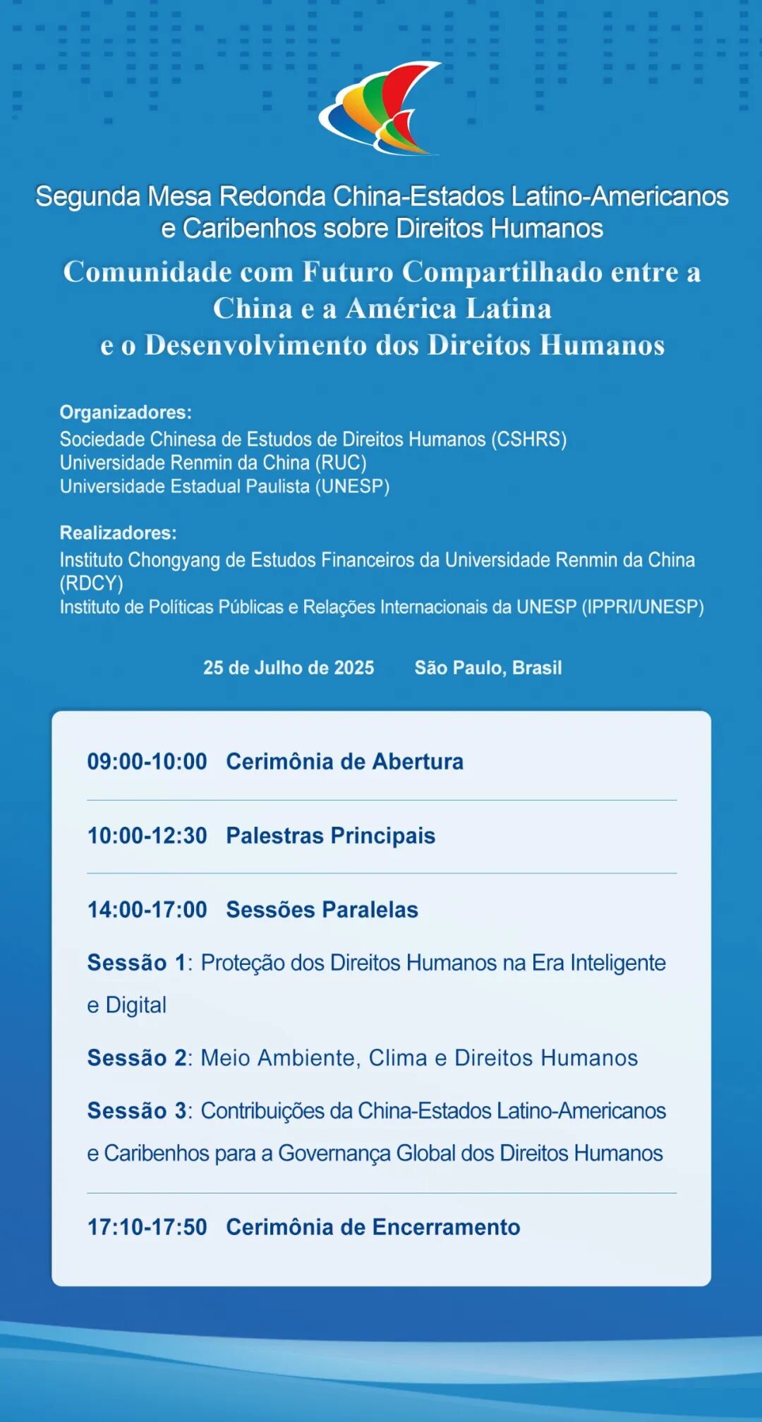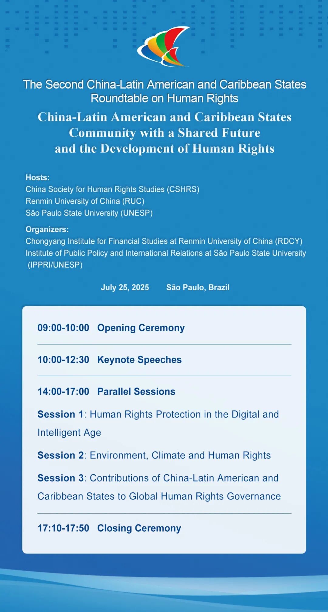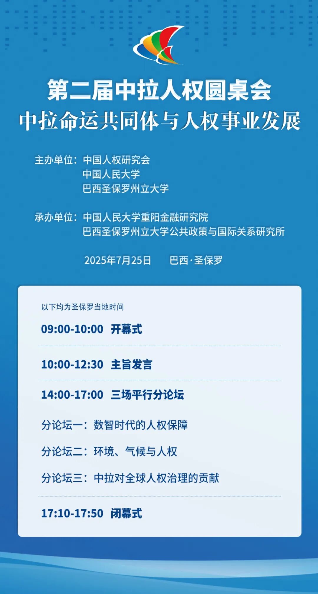 在此背景下,当地时间2025年7月25日,第二届中拉人权圆桌会将在巴西圣保罗举办。本次会议由中国人权研究会、中国人民大学、巴西圣保罗州立大学主办,中国人民大学重阳金融研究院、巴西圣保罗州立大学公共政策与国际关系研究所承办。圆桌会主题为“中拉命运共同体与人权事业发展”,下设“数智时代的人权保障”“环境、气候与人权”“中拉对全球人权治理的贡献”三个分议题,将发布《中拉人权交流合作圣保罗共识》,启动“中拉人权研究合作网络”。现将活动相关安排发布如下:
