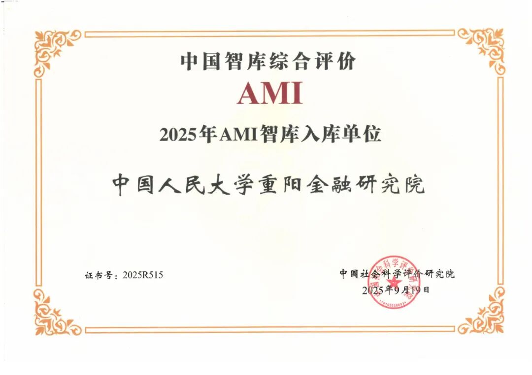 ▲中国人民大学重阳金融研究院入选“中国智库综合评价2025年AMI智库”名单