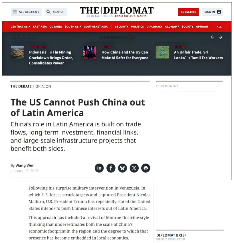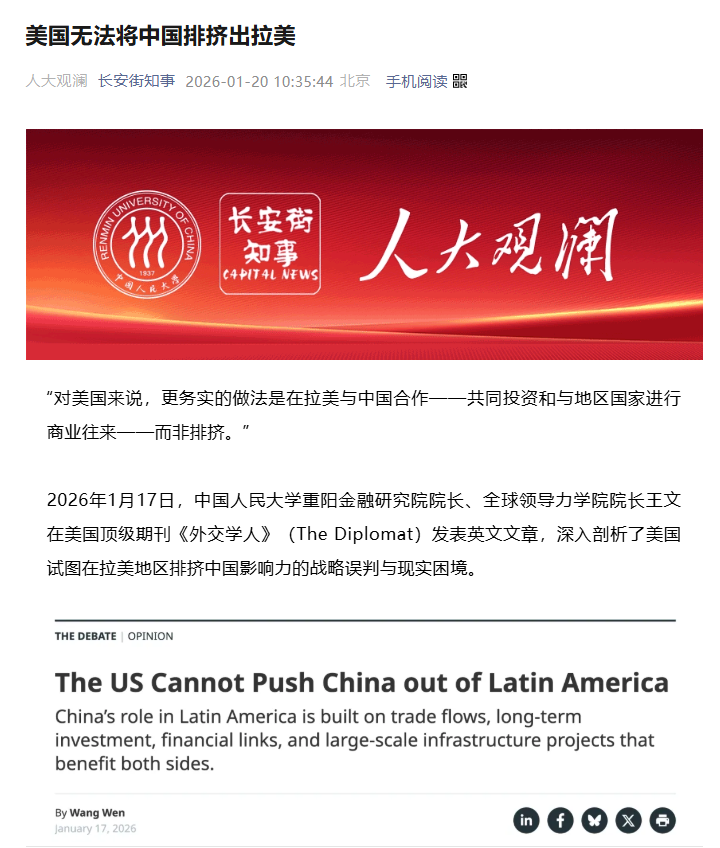 编者按:“对美国来说,更务实的做法是在拉美与中国合作——共同投资和与地区国家进行商业往来——而非排挤。”2026年1月17日,中国人民大学重阳金融研究院院长、全球领导力学院院长王文在美国知名期刊《外交学人》(The Diplomat)发表英文文章,深入剖析了美国试图在拉美地区排挤中国影响力的战略误判与现实困境。1月20日,“长安街知事”微信公众号发表中文译文,现发布如下:(全文约3000字,预计阅读时间8分钟)