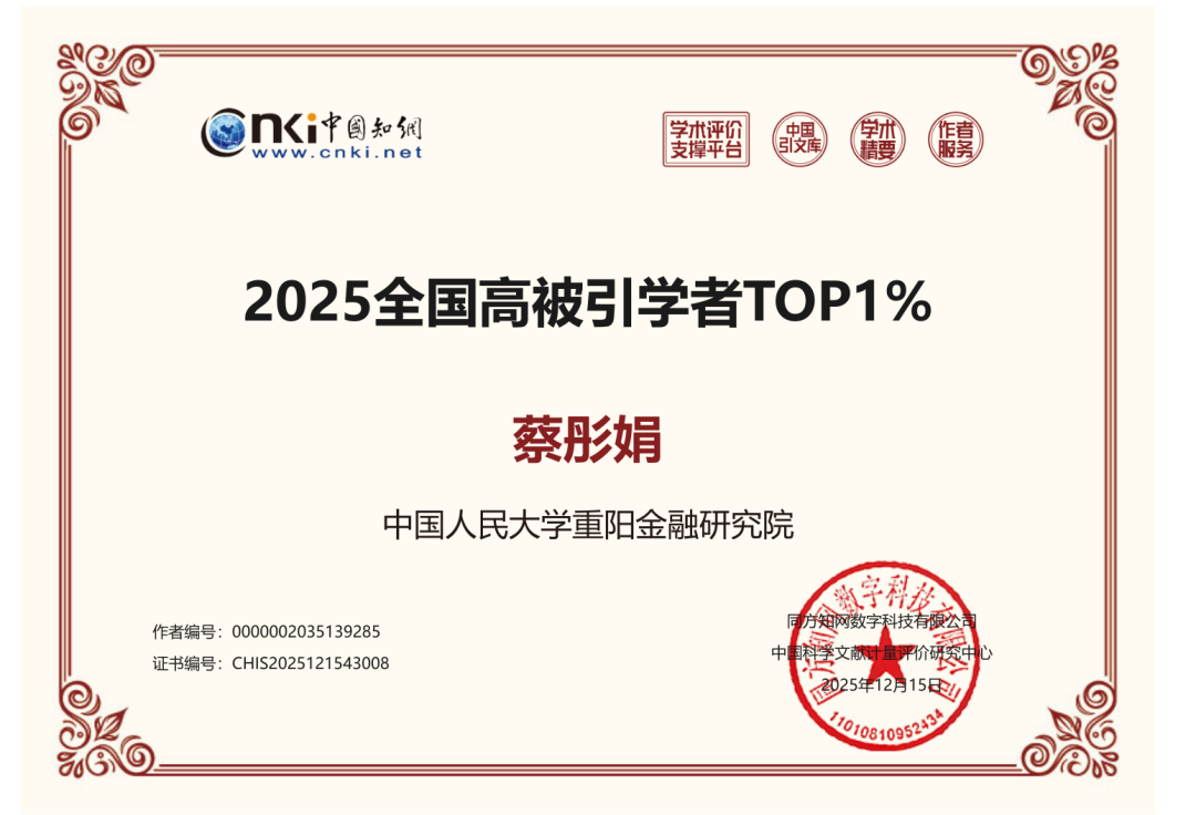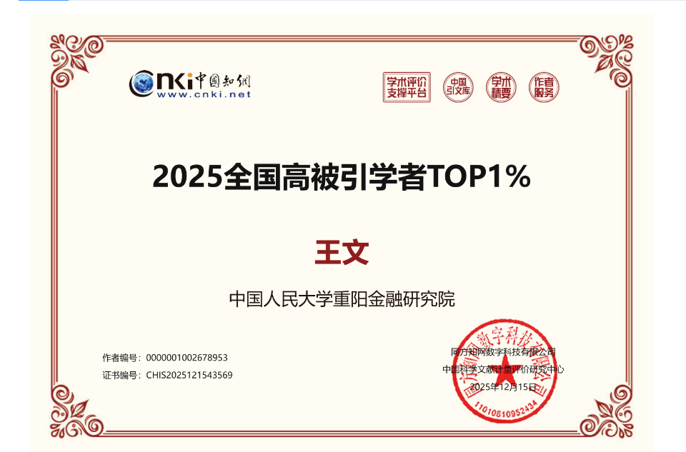 人大重阳网综合报道:近日,作为全球最大的中文文献数据库和知识服务平台之一,中国知网(中国科学文献计量评价研究中心)发布了“2025年全国高被引学者”名单,旨在客观、科学衡量并表彰近十年来国内科研成果丰富、学术影响力杰出的学者群体。中国人民大学重阳金融研究院院长、全球领导力学院院长王文,人大重阳副院长、研究员蔡彤娟继2024年入选中国知网中国科学文献计量评价研究中心首次发布的“2024年中国知网高被引学者Top1%”榜单后,今年再次入选该中心发布的“2025年全国高被引学者Top1%”名单。
