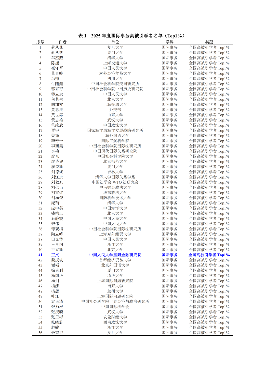 中国人民大学重阳金融研究院院长、全球领导力学院院长王文,人大重阳副院长、研究员蔡彤娟继2024年入选中国知网中国科学文献计量评价研究中心首次发布的“2024年中国知网高被引学者Top1%”榜单后,今年再次入选该中心发布的“2025年全国高被引学者Top1%”名单。