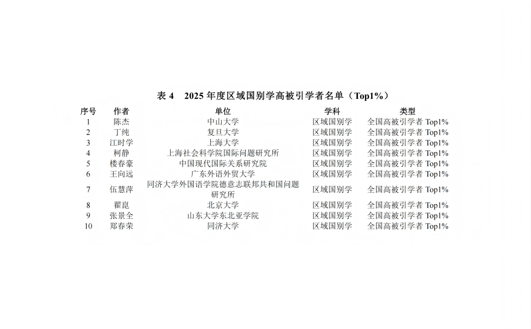 注:表格数据转引自中国知网学术评价支撑平台“2025全国高被引学者”数据库(参见:https://xs.cnki.net/List/HCS_List),仅供学术研究与参考之用。其中,“政治学”和“国际事务”学者名单依据教育部学科目录中法学门类下设的“政治学”(0302)与“国际事务”(0355)学科辑录;“区域国别学”学者名单依据教育部学科目录中交叉学科门类下设的“区域国别学”(1407)学科辑录;“理论经济学”学者名单依据教育部学科目录中经济学门类下设的“理论经济学”(0201)学科辑录。相关数据与学科归类均遵循公开资料整理,不构成任何评价结论或利益判断,数据解释权归原发布平台所有。