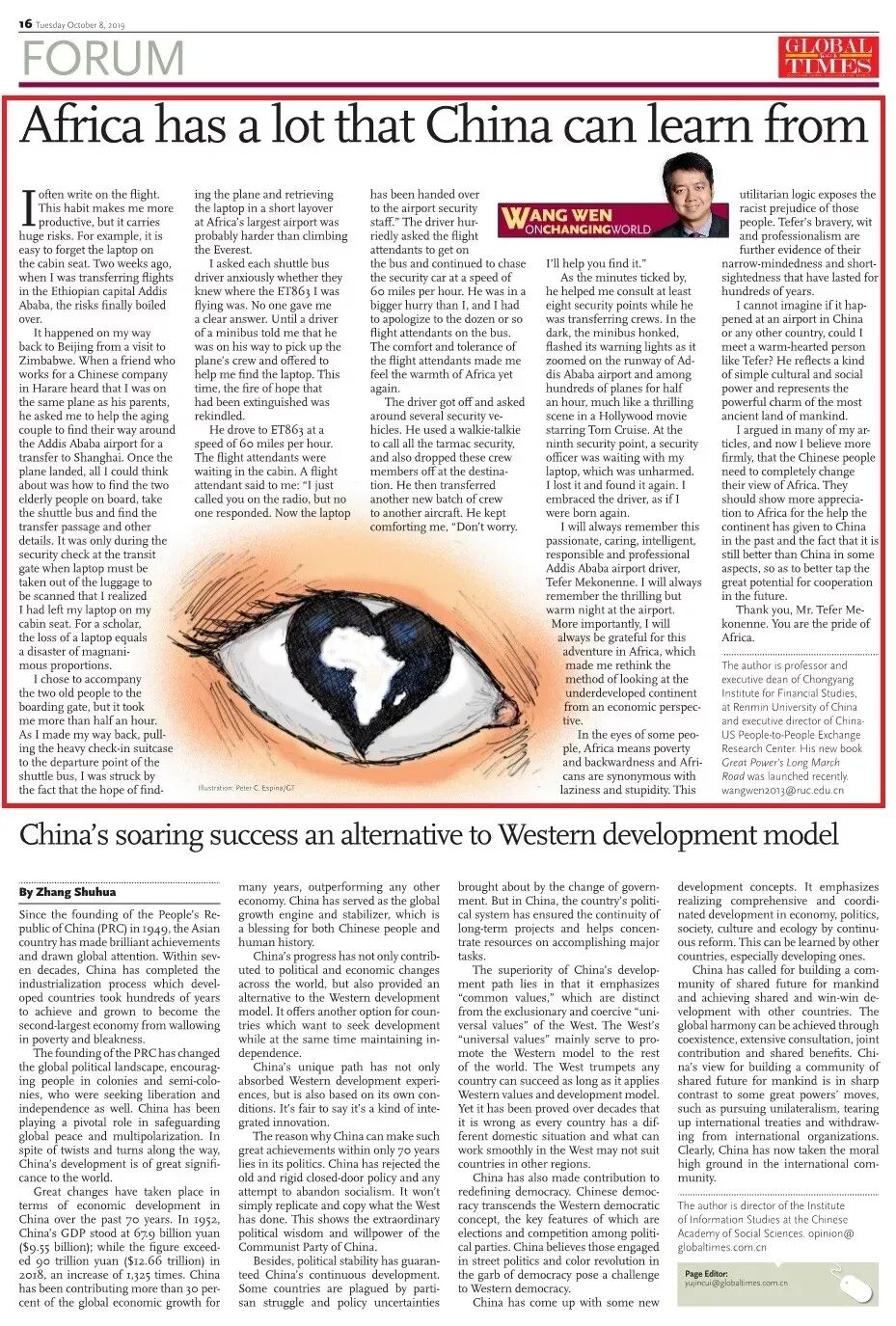 ▲《非洲有许多中国可学之处》一文英文版刊发在《环球时报》2019年10月8日评论版。