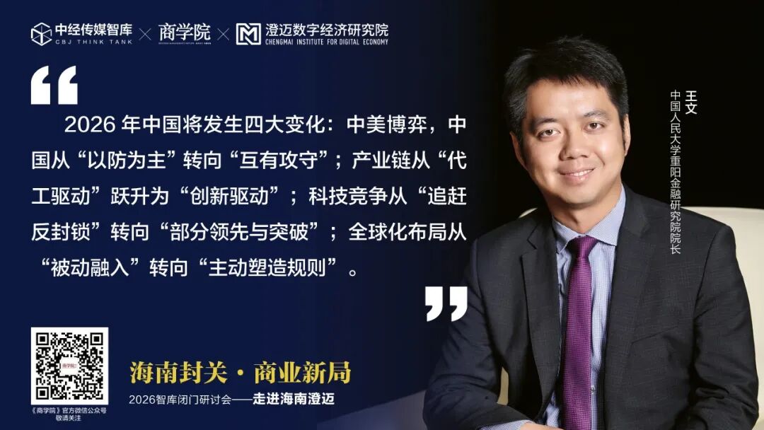 编者按:2026年是二十一世纪第二个四分之一世纪的开端,是新旧格局交替的门槛年,更是中国站在新历史关口、把握下一轮增长机遇的关键节点。近日,“商学院”微信公众号发表了中国人民大学重阳金融研究院院长、全球领导力学院院长王文在“海南封关 商业新局”智库闭门会上的演讲,其中指出,对企业而言,2026年的短期策略应聚焦风险防御与灵活应对,中长期则应坚持自主创新与全球融合。现将演讲全文发布如下:(全文约5800字,预计阅读时间15分钟)