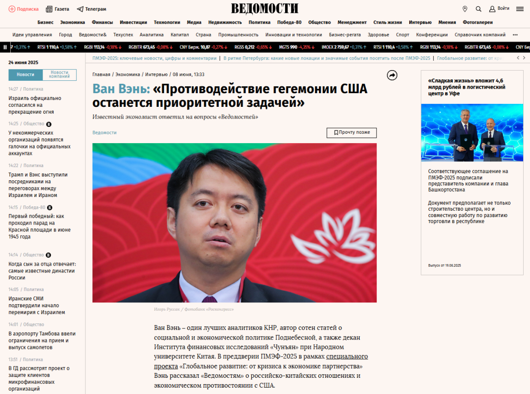 6月18日至21日,2025年圣彼得堡国际经济论坛召开。全球140个国家的政要名流、商界精英出席论坛。应论坛组委会邀请,中国人民大学重阳金融研究院院长、全球领导力学院院长王文就中俄合作、大国兴衰、科技竞争、2035展望等多个重大问题接受论坛会刊的专访,相关内容引起广泛关注。