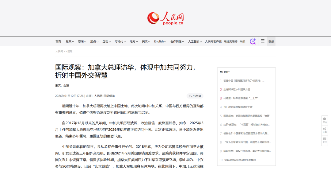 ▲人民网报道截图如上 相隔近十年,加拿大总理再次踏上中国土地,此次访问对中加关系、中国与西方世界的互动都有重要的意义,值得中国舆论深度剖析访问背后的深意与启示。 自2017年12月以来的八年间,中加关系历经波折,政治互信一度降至低谷。