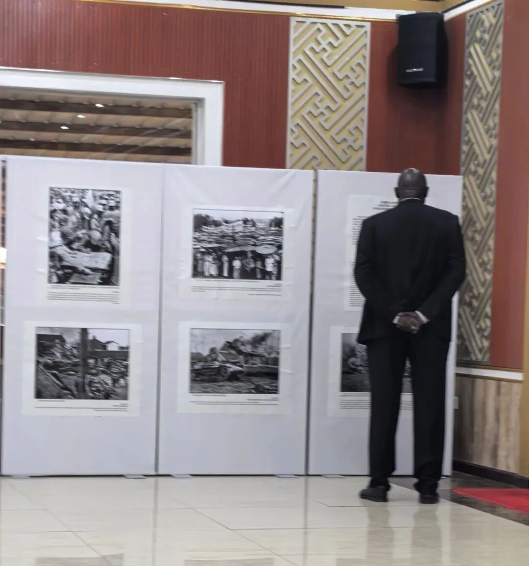 会场两旁展放着纪念中国人民抗日战争暨世界反法西斯战争胜利80周年专题图片,吸引了不少南苏丹与会人士的目光。