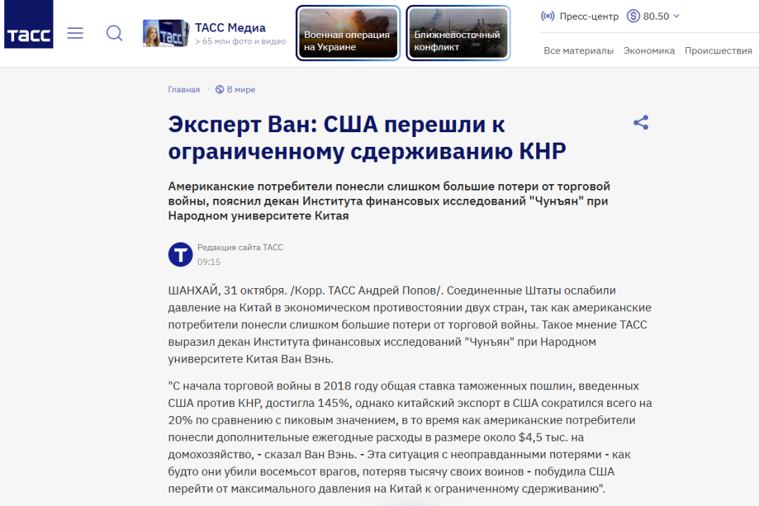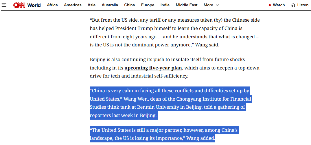 当地时间10月29日,美国有线电视新闻网(CNN)在评论中美元首釜山会晤时,Whatever the outcome, the Xi-Trump meeting is a win for China一文援引王文观点,“面对美国制造的一系列冲突与挑战,中国始终保持冷静态度”。“美国仍是中国的重要合作伙伴,但在当前中国的发展全局中,美国的重要性正逐渐下降”。02美国从对中国极限施压转向有限遏制