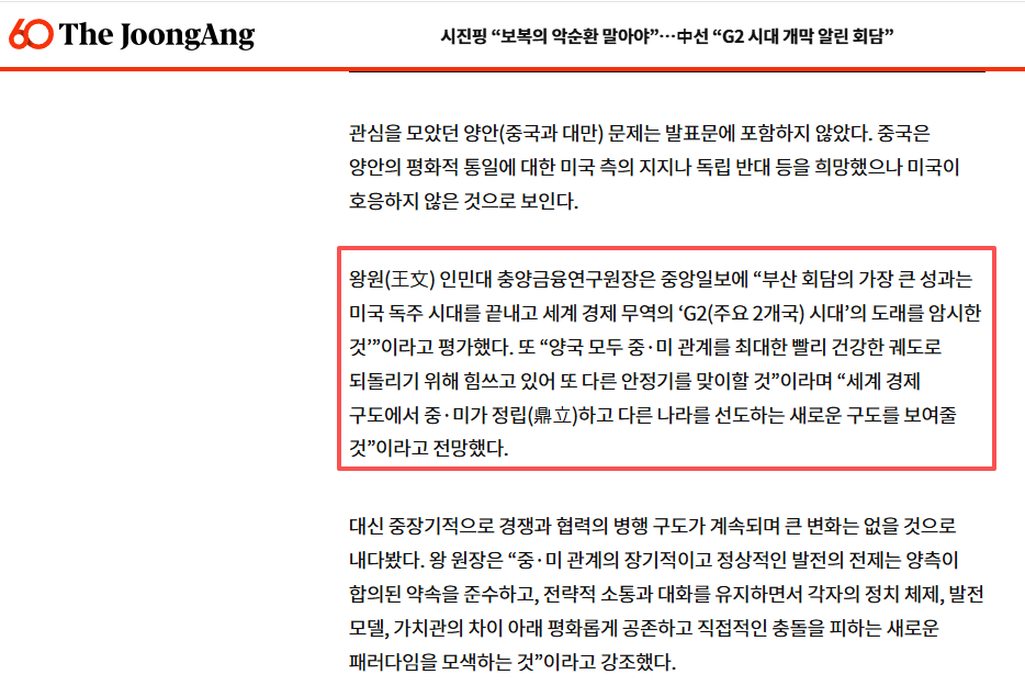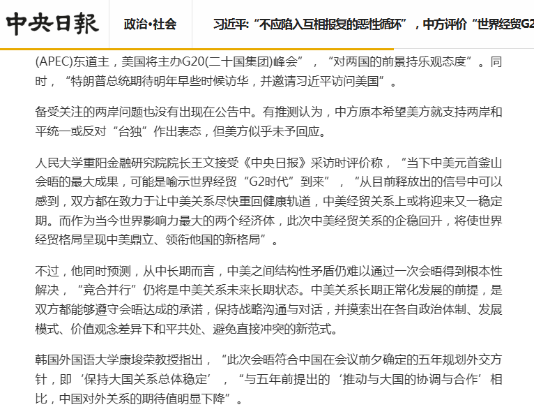 中美元首釜山会晤当天,韩国中央日报第一时间采访王文,随后韩国中央日报网站、纸报及中文版报道王文观点。王文表示,当下中美元首釜山会晤的最大成果,可能是喻示世界经贸“G2时代”到来,从目前释放出的信号中可以感到,双方都在致力于让中美关系尽快重回健康轨道,中美经贸关系上或将迎来又一稳定期。而作为当今世界影响力最大的两个经济体,此次中美经贸关系的企稳回升,将使世界经贸格局呈现中美鼎立、领衔他国的新格局。从中长期而言,中美之间结构性矛盾仍难以通过一次会晤得到根本性解决,“竞合并行”仍将是中美关系未来长期状态。中美关系长期正常化发展的前提,是双方都能够遵守会晤达成的承诺,保持战略沟通与对话,并摸索出在各自政治体制、发展模式、价值观念差异下和平共处、避免直接冲突的新范式。06美国要学会尊重中国