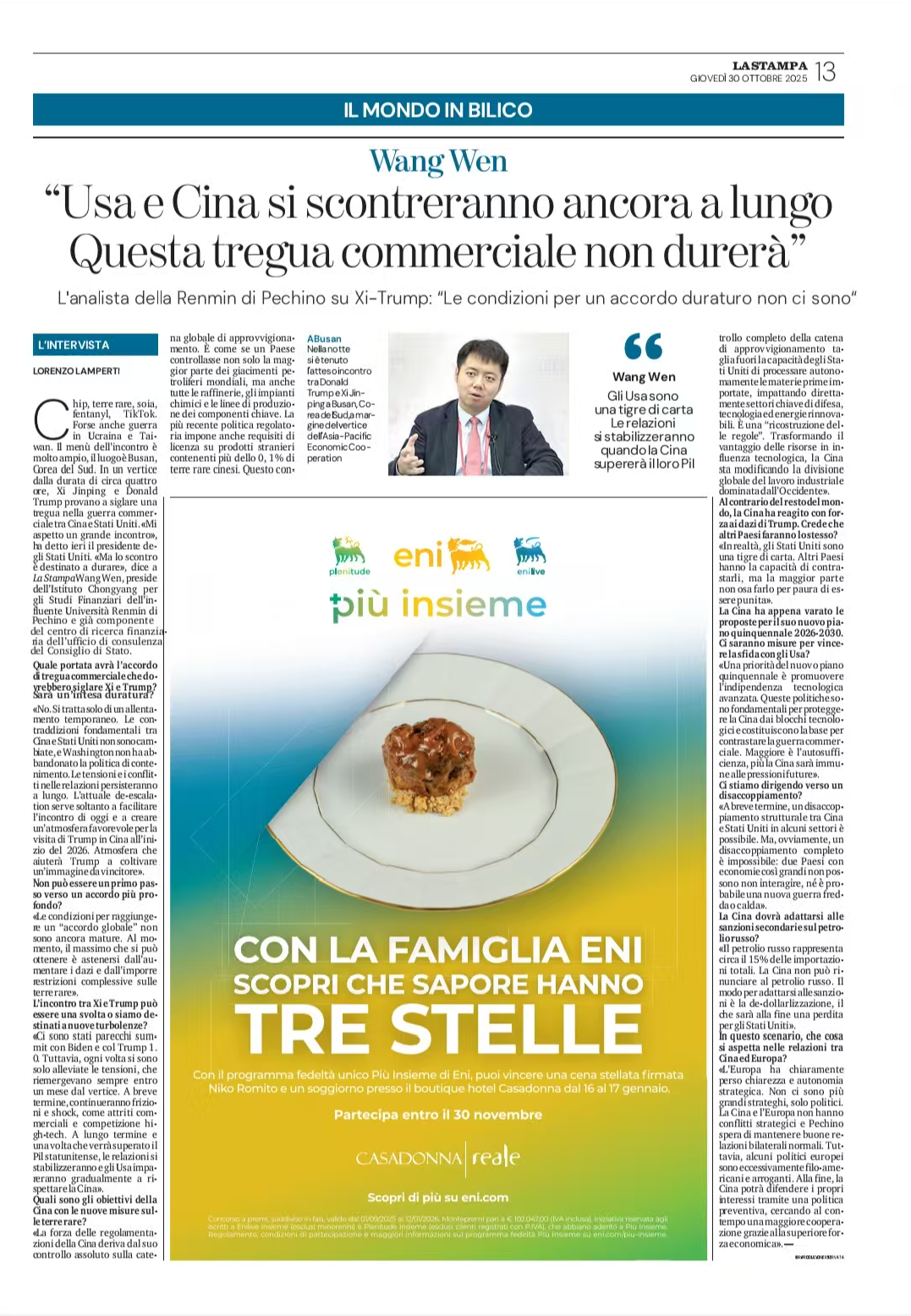 中美元首釜山会晤前夕,王文接受意大利全国性日报La Stampa专访,10月30日报纸整版刊发专访王文内容。谈及关税战时,王文表示,事实上,美国不过是纸老虎。其他国家有能力应对,但大多数国家因为害怕受到惩罚而不敢这样做。关于中美是否正走向脱钩?王文认为,短期内,中美在某些领域的结构性脱钩是可能的,但完全脱钩是不可能的。两个经济体量如此庞大的国家不可能避免互动,爆发新的冷战或热战的可能性也不大。05“竞合并行”仍将是中美关系未来长期状态