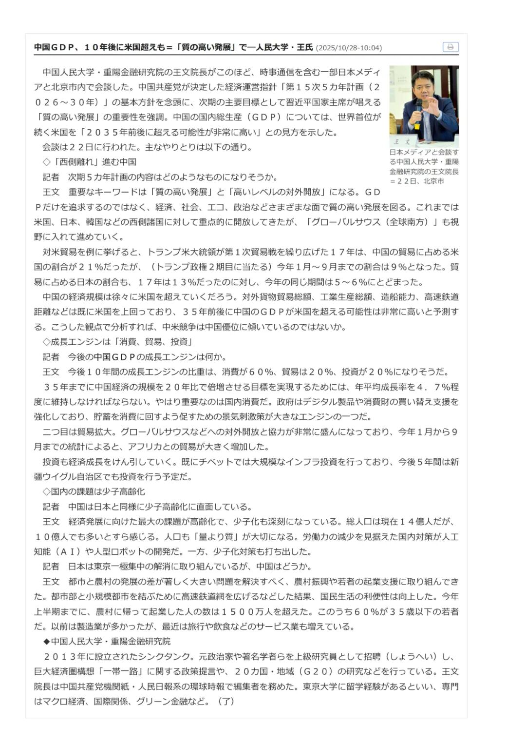 中国人民大学重阳金融研究院院长、全球领导力学院院长王文先后接受美国CNN、俄罗斯塔斯社、日本时事通信社、意大利全国性日报La Stampa、韩国中央日报、卡塔尔半岛电视台、凤凰卫视《全球连线》等7国媒体6种语言专访。