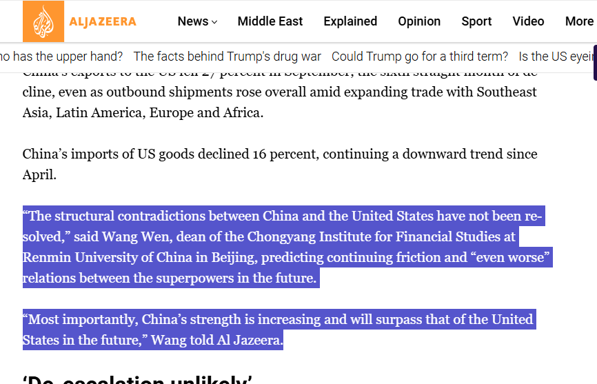 10月30日,俄罗斯塔斯社就中美釜山会晤专访王文。王文表示,自2018年贸易战爆发以来,美国对华加征关税总额已达145%,而中国对美出口仅比峰值下降了20%,美国消费者因此需每年额外支出约4500美元。这种不必要的损失如同“杀敌一千自损八百”。这促使美国从对中国极限施压转向有限遏制。釜山会谈后,双方都做出了让步,包括美国将所谓的芬太尼关税降低了10%。两国还同意加强芬太尼管控合作,扩大农产品贸易,包括中国恢复购买美国大豆。这意味着明年,中国商品进入美国市场的平均关税将降至40%左右。03中美竞争格局正朝着有利于中国的方向倾斜